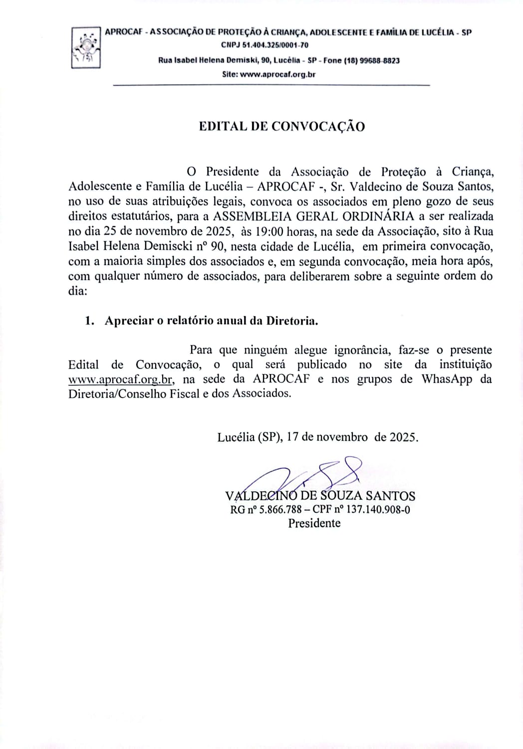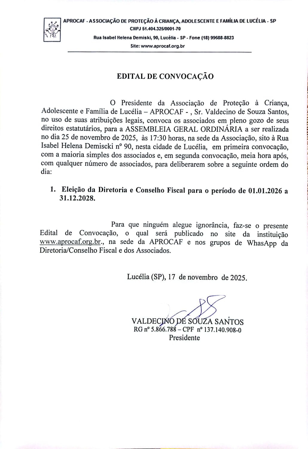 A Associação de Proteção à Criança, Adolescente e Família de Lucélia torna público dois editais de convocação destinados aos associados. Os documentos apresentam informações sobre a realização das Assembleias Gerais Ordinárias, incluindo datas, horários e pautas que serão deliberadas. As imagens abaixo contêm os editais completos para conhecimento e acompanhamento de todos os associados.