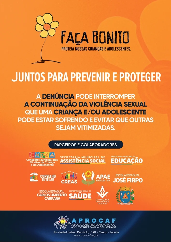 A APROCAF lança a XVI CAMPANHA DE PREVENÇÃO E COMBATE AO ABUSO E À EXPLORAÇÃO SEXUAL DE CRIANÇAS E ADOLESCENTES -2024 cujo objetivo é sensibilizar e conscientizar os pais/responsáveis, profissionais das políticas públicas e a sociedade em geral sobre o papel de cada um de nós na proteção de nossas crianças e adolescentes.